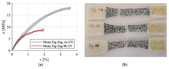Stress–strain curves for zig-zag printing pattern with no UVB treatment and with UV treatment (a); Failure patterns for the UV-B treated samples (b).