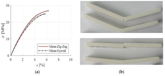 Stress–strain curves from three-point bending tests (a); failed flexural specimens: gyroid (top) and zig-zag (bottom) (b).