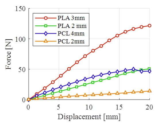 The force-displacement curves for the semi-cylindrical samples are presented in Figure 13 for the analyzed material-thickness configurations. By comparing the slopes of the initial part of the curves, it can be seen that the PLA orthoses were more rigid than the PCL counterparts, with the thicker PCL configuration having a slightly higher rigidity than the thinner PLA configuration. Towards the end of the mechanical tests, the thicker PCL samples suffered a local failure, noticeable in Figure 13, through a decrease in load. The 2 mm thick PCL samples had very low stiffness, which makes this thickness unsuitable for 3DP WHOs.