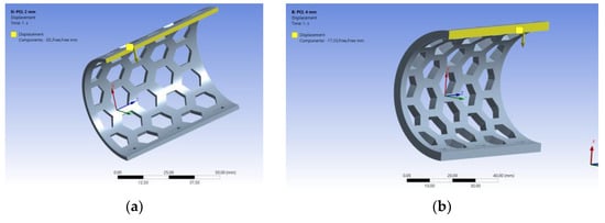 As a result of the mechanical tests, forces and displacements were determined for the PCL semi-cylindrical samples of different thicknesses. The obtained displacements were used in the numerical simulation to validate the models, namely to compare the forces obtained from the simulation with the experimental ones. For the 4 mm sample, a deformation of 17.30 mm was recorded (Figure 14a). This value was further used to develop the model as being the maximum force reached. For the 2 mm thick samples, the 20 mm displacement was adopted for the same reason (Figure 14b).