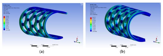 After running the simulations, forces of 13.509 N for the 2 mm model, and 53.143 N for the 4 mm model were obtained. Figure 15 shows the resulting stress for the semi-orthoses models, with the connection areas having the highest values.