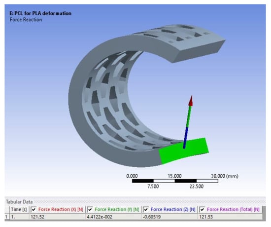 Next, the model was used to identify the thickness of the PCL semi-orthosis which provides the same stiffness as the PLA semi-orthosis with a 3 mm thickness. In this sense, the objective function set in the optimization module in ANSYS was to achieve the maximum recorded force corresponding to the PLA sample of 3 mm (i.e., 121.53 N). As presented in Figure 16, this force is obtained if the thickness of the PCL semi-cylindrical samples is 4.9 mm.