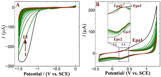 Figure 2A displays the CV trace of the GO/GC electrochemical reduction process in the potential of 0.0 V to −1.50 V at a sweep rate of 50 mV s−1 in 0.2 M PBS (pH 7.2). The first cycle of the voltammogram showed a broad cathodic peak from −0.8 to −1.5 V. This cathodic peak corresponds to the epoxy, carbonyl, and hydroxyl group reduction [9]. The electrochemical reduction of GO to ERGO occurred by adding a proton from the supporting electrolyte and an electron from the electrode. The possible hydroxyl-group-reduction mechanism is given in Equation (1) [37,38]:
