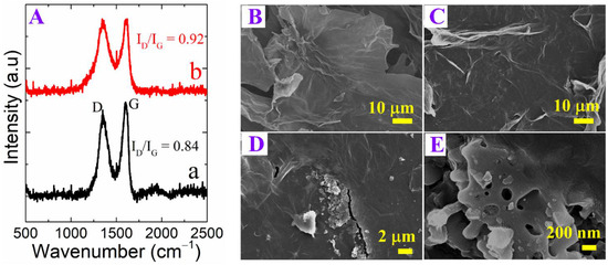 (A) Raman spectra of (a) GO and (b) ERGO; (B–D) FESEM of GO (B), ERGO (C), and p-DPA@ERGO (D); (E) high magnification image of p-DPA@ERGO.