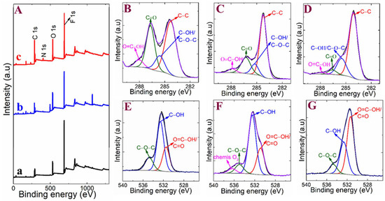 (A) XPS survey spectrum of (a) GO, (b) ERGO, and (c) p-DPA@ERGO; (B,E) GO C 1s and O 1s; (C,F) ERGO C 1s and O 1s; (D,G) p-DPA@ERGO/GC C 1s and O 1s region spectra.