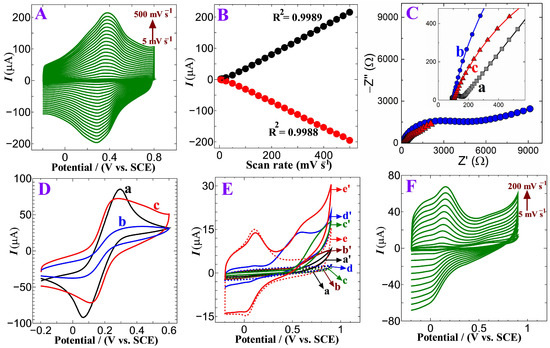 (A) CV scan rates of p-DPA@ERGO/GC in 0.1 M H2SO4 from 5 to 500 mV s−1, (B) corresponding plot of peak current (I) versus scan rate; (C,D) electrochemical impedance spectroscopy and CV of (a) bare GC, (b) p-DPA/GC, and p-DPA@ERGO/GC in [Fe(CN)6]3−/4− (5 mM) solution of 0.1 M KCl; (E) CV trace of (a) bare GC, (b) activated GC, (c) p-DPA/GC, and (d) ERGO/GC, and (e) p-DPA@ERGO/GC-modified electrodes in the absence of analyte and a′, b′, c′, d′, and e′ in the presence of 1 mM PA with 0.1 M PBS at a 50 mV s−1 scan rate; (F) scan rate effect of the p-DPA@ERGO/GC electrode in PA concentration of 1 mM.