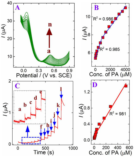 The DPV technique was performed to investigate the sensitivity of the p-DPA@ERGO/GC-coated electrode towards the wide concentration of PA determination ability. Figure 7A shows the DPV of PA detection on the p-DPA@ERGO/GC electrode; the PA oxidation peak potential was observed at +0.62 V. The modified electrode sensed PA concentrations from 10 to 4015.5 µM. Figure 7B shows the equivalent calibration plot of the PA oxidation current versus concentration. The two linear regression equations for the low and high concentration ranges were Ipa = 0.0026[PA] + 5.593 with R2 = 0.985 and Ipa = 0.0011[PA] + 6.638 with R2 = 0.986, respectively. The sensitivities of low and high concentration ranges were 0.0026 µAµM−1 and 0.0011 µAµM−1, respectively. From the calibration plot, the limit of detection (LOD = 3s/S) was 0.30 µM. Figure 7C shows the successive 60 s interval PA additions performed with a fixed applied potential of +0.62 V. The amperometric current increased with every successive addition of PA with low and high concentration ranges (1.4–541 µM). The oxidation current increased considerably over a wide range as the PA concentration was increased, and Figure 7D shows the corresponding calibration curve. From the calibration curve, Ipa = 0.0024[PA] + 0.0984 with R2 = 0.981. The calculated LOD of PA on the p-DPA@ERGO/GC electrode was 0.10 µM. The linear range and low LOD values from the present study technique were compared with the existing reports (Table 1). The present p-DPA@ERGO/GC result emphasizes the developed electrode ability to determine the wide PA sensor range and low LOD ability. The obtained high sensitivity and low LOD detection ability of the developed electrode might be useful for the bio-clinical analysis of PA in blood serum samples.