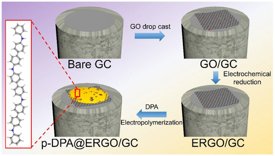 Scheme 1 presents the comprehensive electrode coating steps. Before the GO coating on GC, the electrode was polished with 1.0, 0.3, and 0.05-micron alpha alumina powders and swept away thoroughly with DI water. The electrode probe was then exposed to an electrochemical activation process by successive CV cycling (10 cycles) in a 0.1 M H2SO4 electrolyte in the potential window from −0.2 V to 1.0 V [34,35]. The cleaned GC electrode was used for surface modification. The as-prepared GO (5 mg) was dispersed in 5 mL of ethanol in a 5% NafionTM solution with ultrasonication for 20 min to acquire a homogenous suspension. Subsequently, 10 μL of the GO suspension spread onto a clean GC surface and dried at room temperature. The GO/GC coated electrode was subjected to electrochemical reduction in PBS (0.2 M, pH 7.2) by CV cycling over the potential range of 0.0 V to −1.5 V with fifteen sweeps to achieve the ERGO/GC. The ERGO/GC electrode underwent electropolymerization of DPA by cycling between the potential window of −0.4 V to +1.3 V in the presence of 1 mM DPA in 0.1 M H2SO4 supporting electrolyte, which yielded the p-DPA@ERGO/GC [36]. Similarly, the p-DPA@GC electrode was obtained using the same procedure on the GC surface. Similar to the above method, p-DPA@GC, ERGO/GC, and p-DPA@ERGO/GC electrodes were prepared on the GC-plate surface for X-ray photoelectron spectroscopy (XPS), Raman spectroscopy, and surface microstructure studies.