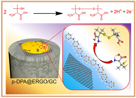 The different modified electrodes were evaluated for the electrochemical detection of PA. Figure 6(Ea–Ee) represents the CV response of the bare GC, activated GC, p-DPA/GC, ERGO/GC, and p-DPA@ERGO/GC-modified electrodes absence of PA (in a 0.1 M PBS supporting medium). The CV response of bare GC, activated GC and p-DPA/GC electrodes offered a low background current in a PBS solution, but the ERGO/GC electrode showed a high background current because of its high conductivity. In contrast, the p-DPA@ERGO/GC electrode shows well-defined polymer redox couple peaks at +0.10/+0.05 V. The polymer redox potential difference (∆Ep) for p-DPA@ERGO a 50 mV, which is lower than the p-DPA/GC-coated electrode (70 mV). This is because the combination of electrochemically active p-DPA and conductive ERGO forms an effective electroactive platform on the p-DPA@ERGO/GC electrode surface. Figure 6(Ea′–Ee′) shows CV in the presence of 1 mM PA with bare GC, activated GC, p-DPA/GC, ERGO/GC, and p-DPA@ERGO/GC-modified electrodes (0.1 M PBS supporting medium). The bare GC, activated GC, and p-DPA/GC-modified electrode showed an anodic peak at approximately +0.65 V that was related to the oxidation of PA. The ERGO/GC had a PA oxidation peak current of 13 μA. In contrast, the p-DPA@ERGO/GC electrode showed an enhanced anodic peak current of 19 μA (+0.62 V), which was approximately two times higher current and lower oxidation potential than the bare GC, activated GC, and p-DPA/GC electrode. The PA sulfuryl (–SH) functional group and polymer nitrogen group electrostatic interaction confers outstanding electrochemical performance. This leads to better PA mass transport properties. Scheme 2 shows the proposed possible mechanism of PA detection on the p-DPA@ERGO/GC electrode. Figure S2A (see Supplementary Materials) shows the different concentrations of PA (from 50 to 500 μM) addition on the p-DPA@ERGO/GC-coated electrode. The CV curve exhibited a gradual current increase as the PA concentration was increased. The corresponding calibration curve of Ipa = 0.0131[PA] + 3.98 with R2 = 0.993 (Figure S2B, see Supplementary Materials). Figure 6F presents the CV traces of various scan rate effects (5 to 200 mV s−1) of PA in 0.1 M PBS (pH 7.2) using a p-DPA@ERGO/GC electrode. The anodic oxidation peak current increased linearly with a positive direction potential shift as the scan rate (ν) was increased. A linear relationship existed with an anodic peak current against the square root of sweep rate (ν)1/2 (Figure S2C, see Supplementary Materials) with a correlation equation of Ipa = 2.645ν1/2+ 0.3480, with (R2 = 0.998). Furthermore, the double logarithm plot of log ipa versus log scan rate (Figure S2D, see Supplementary Materials) showed the following regression equation: log Ipa = 0.5148 log (ν) − 0.3867 and an R2 value of 0.997. These results showed that the oxidation process at the p-DPA@ERGO/GC electrode was diffusion-controlled.