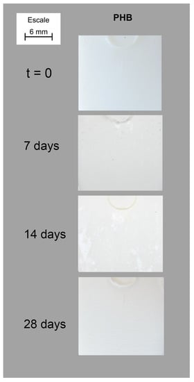 Once the samples have been submitted to environmental conditioning, the surface of the samples of the composites was observed from macro pictures taken with a still camera. Figure 1 shows the behavior of plain PHB showing the permanence of the white colour of this matrix for the full period of exposure. However, a change in the whiteness of the samples is clearly appreciable. Moreover, some surface deposition could also be observed. This effect was more visually observable when fibres were added to the composite composition as an increase in the loss of colour was observed, independently of the fibres added.