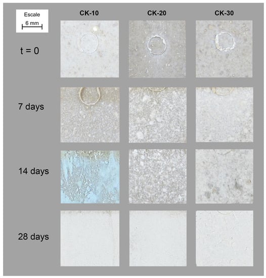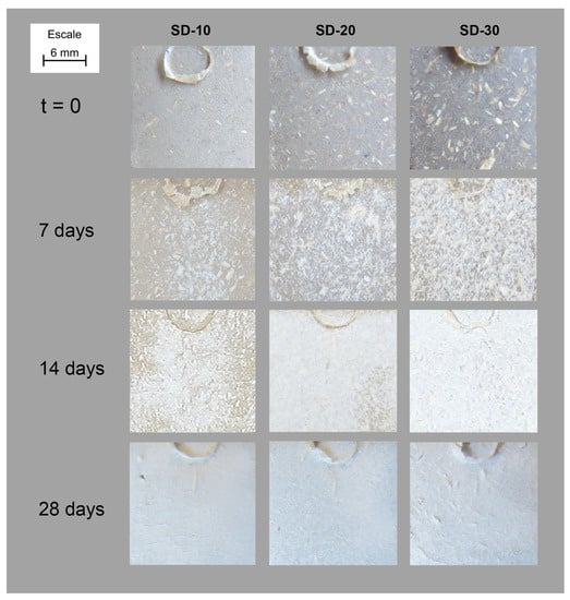 An example of this behaviour is Figure 2, where the evolution of the surface of SD-composite formulations (SD-10, SD-20 and SD-30) after 1, 2 and 4 weeks of exposure is represented. It is possible to observe the big granulometry of barley straw fibres, as only a milling process was performed to reduce their particle size to improve their incorporation into the matrix during mixing.