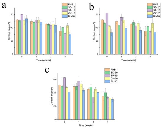 It is expected that the bleaching phenomenon may be related to a change in the chemical structure of the materials on the surface. In this sense, an increase in polarity could be consistent with this effect, which is attributed to the oxidation of the surface []. A way to determine the change in the chemical structure of the surface of the materials is the determination of the contact angle of the materials. Figure 4 shows the values of the contact angle of the composites reinforced with all the processed fibres as well as the time of exposure under the environmental conditions.