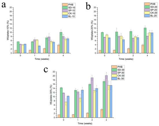 Another interesting result can be observed in Figure 5, where water uptake is now shown by comparing all the fibres at the same composition. Considering the percentage of fibres added to the polymer matrix, the water uptake is generally higher for the formulation including fibres such as sawdust (SD formulations). Such a formulation is based on the incorporation of fibres obtained by a milling process of barley straw without any other prior processing, neither chemical or physical, which shows the highest particle size. This particle size also helps to create higher interfaces with low compatibility between the polymer and the fibres. Moreover, these fibres include every chemical component of the original lignocellulosic resource, thereby increasing its heterogeneity and consequently the incompatibility with the polymer matrix. On the other side, the formulations including cooked and bleached fibres show the lowest water uptake capacity for every composition (10, 20, and 30 wt%), which indicates that the homogeneity in the structure, due to a higher content in cellulose, helps compatibility by decreasing the capacity of water uptake, showing a more stable character against aqueous media. In this sense, it is expected that the formulations with sawdust and defibrated fibres can retain the biodegradable character when helped by a better diffusion of water through their structure.
