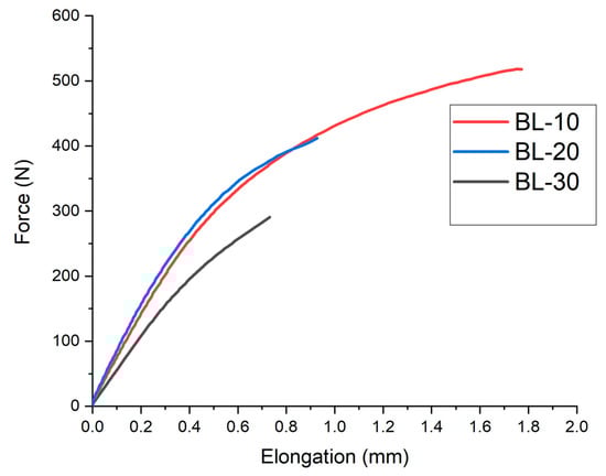 Force-elongation trends of composites of PHB reinforced with BL barley fibres tested after 14 days of exposure to environmental conditions.