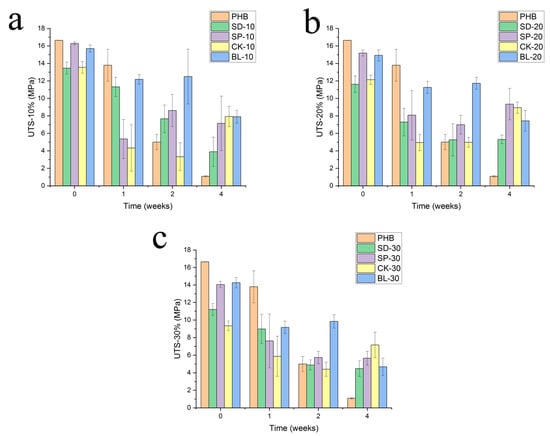 According to this explanation, ultimate tensile strength has been determined and are summarized in Figure 7. The incorporation of fibres showed two different behaviours depending on the exposure time to the environmental conditioning. During the first 7 days, plain PHB showed higher mechanical strength than the composites reinforced with barley straw fibres. After this first week, the structure of plain-PHB samples showed a drastic decrease in mechanical strength but when reinforced with barley fibres this decrease stopped, keeping the structural strength for a longer time. Thus, after 28 days of exposure, the samples based on only PHB have a strength even lower than 1 MPa, while those reinforced with fibres ranged between 4–8 MPa depending on the pre-treatment of the fibre and its percentage in the composition.