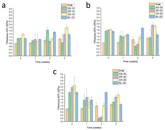 Young Modulus profile is shown in Figure 8. Young’s Modulus of plain PHB is very stable during the characterization period (4 weeks of exposure). In the case of the formulations reinforced with barley fibres, this behavior is more random due to the high heterogeneity of the materials related to the low compatibility fibre matrix. In general terms, two different behaviours have been observed when the composites are studied: composites reinforced with SD and SP fibres and that of CK and BL. The reinforcing of the composite by means of fibres with the same composition as the original barley fibres (SD-SP) simulates the behavior of PHB during the first stages of the exposure at low percentages of addition. After 2 weeks of exposure, the degradation of the materials involved a drastic decrease in Young’s modulus, which is higher when the composition of fibres in the composite increases. The low compatibility of the lignocellulosic residue together with the previously reported high capacity for water uptake induced by these fibres gave rise to a plasticization effect on the material due to the absorption of water.