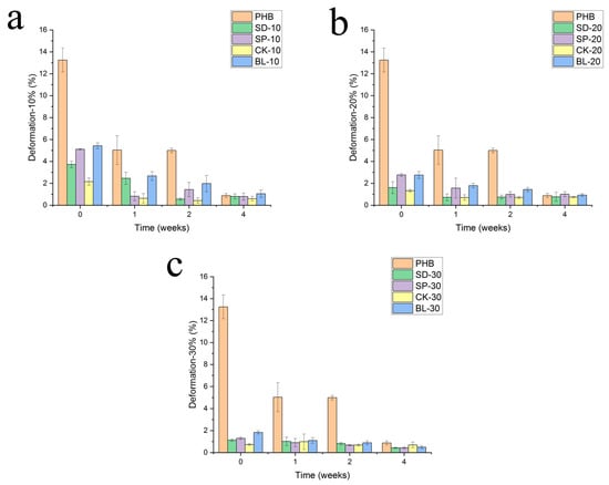 In this sense, the incorporation of barley straw fibres improved the mechanical stability and integrity of the material for a longer time compared to the performance of the plain polymer matrix. The incorporation of fibres to improve the mechanical stability of polymer matrices has often been reported as cellulosic materials have longer degradation periods [,].