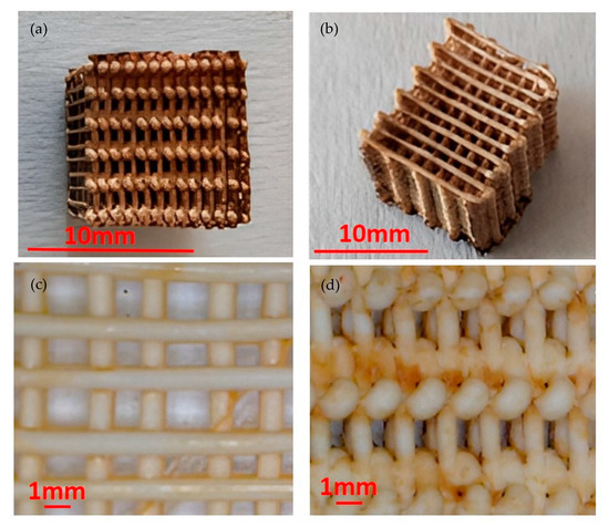 Fusion360 software was used for the first and second phase; for the third and fourth steps, Ultimaker Cura software was adopted. The printing of the 3D structures was performed through fused deposition modeling (FDM) using the printer Creality CP-01 and a PLA filament, white in color and with a diameter of 1.75 mm. A woodpile-shaped scaffold (Figure 1) with an external shape of a cube was printed setting the following operating conditions: nozzle diameter equal to 0.8 mm, extrusion temperature equal to 200 °C, printing speed of 60 mm/s, infill density of 30%, infill line distance of 1.1 mm, layer height of 0.4 mm. It is important to note that the selection of an adequate building strategy is very relevant to obtain the required macroporosity of the catalyst. In particular, the selection of the right infill density parameter is crucial to obtain the geometry of the samples. The obtained scaffolds, as the one shown in Figure 1a, are characterized by a weight of 0.56 + 0.02 g, a volume of 1.248 cm3, and a density of 0.45 g/cm3. The surface area, relevant for the catalytic behavior of the scaffold, is 38.30 cm2.