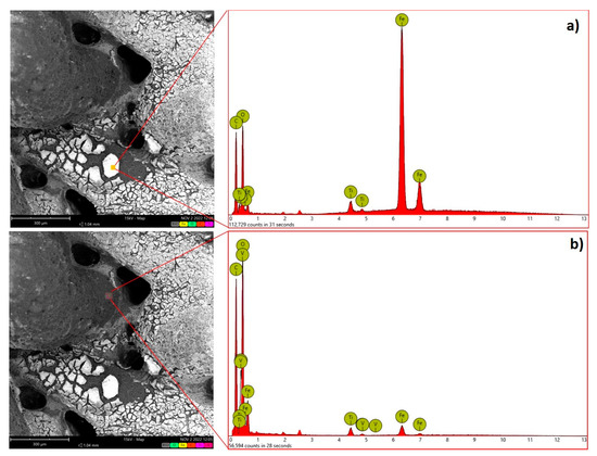 The pictures taken by optical microscope, shown in Figure 1a,b, show that the external surfaces of the coated scaffold are characterized by a brown color due to the ferrous oxide. However, the midplane of the catalyst, shown in Figure 1c, is characterized by a lower amount of ferrous, indicating that the coating treatment is more effective on the external surfaces of the scaffold. A longer treatment time should lead to a more uniform distribution of the coating. A non-fully homogeneous distribution of Fe on the external surface is shown in Figure 1d.