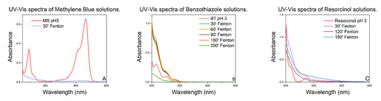 Figure 3 shows the UV–vis spectra of the experiments carried out on methylene blue (Figure 3A), benzothiazole (Figure 3B), and resorcinol (Figure 3C). It is evident that the chosen catalyst can completely degrade the chosen model molecules in a time between 30 and 200 min.