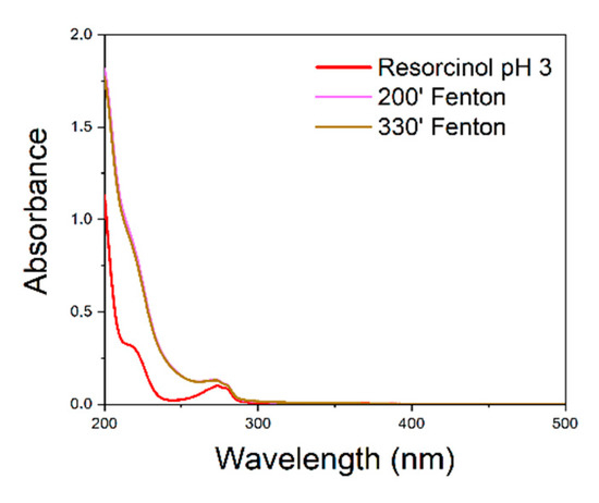 UV–vis spectra of Fenton-processed resorcinol solution using the unregenerated catalyst for the second time. UV–vis spectra recorded after 200 and 330 min overlap.