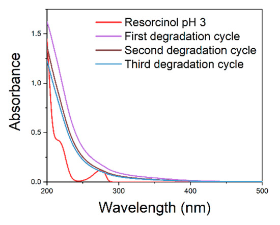 UV–vis spectra of Fenton-processed resorcinol solution using the catalyst after regeneration with hydroxylamine hydrochloride.