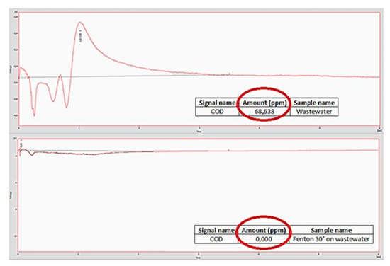 As shown in Figure 6, comparing the two plots and the ppm of residual organic compounds circled with red, a complete abatement of the species present in the sample is achieved within just 30 min after adding the reagents and the catalyst. We can, in fact, observe that the total amount of residual organic compounds in the sample of wastewater (in the plot above) is equal to 68,638 ppm, while the amount of the residual organic compounds after only 30 min of Fenton treatment on the same sample is equal to 0 ppm.