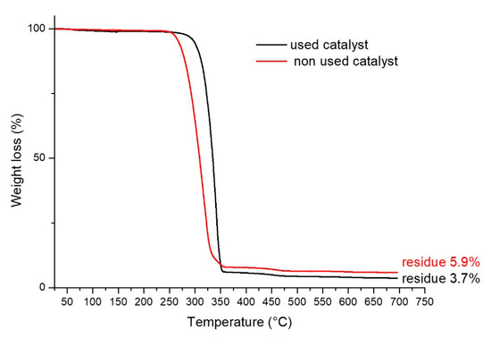 Thermogravimetric analysis of the catalyst before its use and after 3 reaction and regeneration cycles.