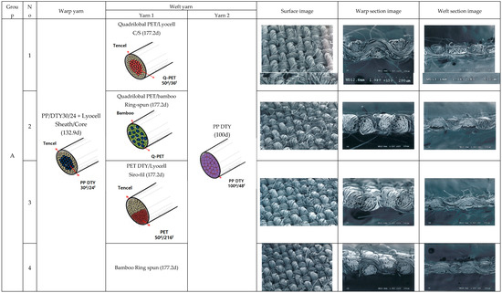 In Figure 1, warp section images show SEM images of warp yarns cut perpendicular to the warp direction. The warp section from specimens 1 to 5 (group A) shows PP/Lyocell sheath/core yarns and many air voids along the round-shaped border between core and sheath in the yarn cross-section corresponding to the schematic diagram of the warp yarn. The weft section images show SEM images of weft yarns cut perpendicular to the weft direction, i.e., The SEM image of specimen 1 shows quadrilobal PET/Lyocell sheath/core yarn and PP yarn; quadrilobal PET/bamboo ring-spun yarn and PP yarn for specimen 2; PET/Lyocell Siro-fil yarn and PP yarn for specimen 3; bamboo ring-spun yarn and PP yarn for specimen 4; and PET yarn and PP yarn for specimen 5. These were compared with schematic diagrams of the yarn models.