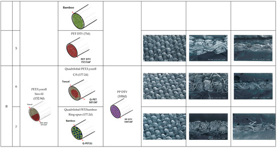 A prior study [1] referred to optical microscopy and SEM images of the yarn specimens (Table 6 in ref. [1]). Capillary channels of many air voids on the border between the sheath and core in the PP/Lyocell sheath/core yarns (1) were observed (Table 6 in ref. [1]). By contrast, a compact yarn cross-section was observed in the PET/Lyocell Siro-fil yarn (2), and small voids appeared in the Lyocell Siro-spun yarn (3). The capillary channels in the sheath/core yarns (1) allow the moisture absorbed by Lyocell wrapper fibers to move out easily through the PP filaments in the core. PET/Lyocell Siro-fil yarns (2) impede moisture flow in the yarns because of the small pore size and compact yarn structure by the Siro-twist in the yarns (Table 6 in ref. [1]). Lyocell Siro-spun yarns (3) have a similar yarn structure to the Siro-fil yarn by the Siro-twist. In addition, quadrilobal PET/Lyocell sheath/core yarns (4) have same yarn structure as PP/Lyocell sheath/core yarns, i.e., the capillary channels shown in Table 6 (in ref. [1]) between the Lyocell fibers in the sheath and quadrilobal PET filaments in the core enable absorbed moisture and vapor through the sheath to evaporate from the yarns. Many micro-voids in the quadrilobal PET/bamboo ring spun yarns (5) provide drainage channels to remove and evaporate the moisture and vapor absorbed from the human body.
