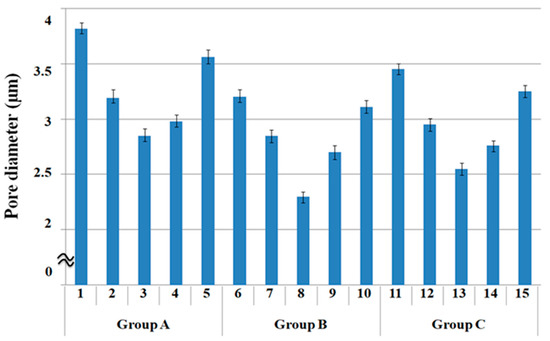 Figure 2 presents a diagram of the pore diameters of the 15 fabric specimens listed in Table 3 [1]. The pore diameters of the three groups of fabrics were compared according to the warp yarn structure. The pore diameters of the five specimens in group A were greater than those in groups B and C because the pore size of the PP/Lyocell sheath/core yarns used as a warp yarn of group A is larger than that of the PET/Lyocell Siro-fil and Lyocell Siro-spun yarns used as the warp yarns of groups B and C. These were verified by SEM and optical microscopy of the constituent warp yarns used in the fabric specimens, which was referred to prior study (Table 6 in [1]).