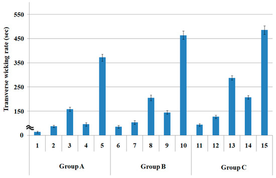 In addition, concerning the transverse wicking rate according to the warp yarn structure (Figure 3), the transverse wicking rates of group A were lower than those of groups B and C. Hence, superior wicking property was observed, which was caused by the larger pore diameter because of the sheath/core yarn structure of the warp yarns of group A fabric specimens (1 to 5).
