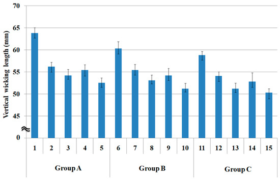 In addition, regarding the vertical wicking length according to warp yarn structure (Figure 4), the vertical wicking length of the group A fabrics (specimens 1 to 5) was greater than those of groups B (specimens 6 to 10) and C (specimens 11 to 15). That is, the superior wicking property was attributed to the sheath/core yarn structure of the warp yarns of group A fabric specimens. Finally, consistency was noted between the two evaluation methods. Hence, the results obtained through transverse and vertical wicking evaluations of the eco-friendly fiber-embedded fabrics with different yarn structures showed a similar trend.