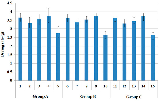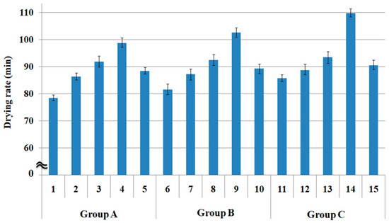 In addition, hi-multi PET filament fabric 5 exhibited relatively good drying properties (i.e., low drying rate) compared to Siro-fil fabric 3 and spun fabric 4 (Figure 5), which was caused by the larger pore size of fabric 5 (Figure 2) than that of the Siro-fil and bamboo spun fabrics (specimens 3 and 4), which showed a little different trend compared with the wicking phenomena. A similar trend to the drying rate (mm) according to the fabric group A (1 to 5) was observed in groups B (6 to 10) and C (11 to 15). In addition, the drying rate (min) according to the warp yarn structure showed a similar trend to the wicking property, as mentioned previously.
