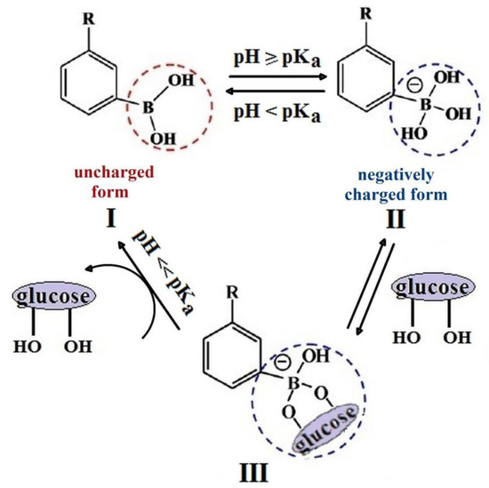 - Zhang, C.; Losego, M.D.; Braun, P.V. Hydrogel-Based Glucose Sensors: Effects of Phenylboronic Acid Chemical Structure on Response. Chem. Mater. 2013, 25, 3239–3250. [Google Scholar] [CrossRef]