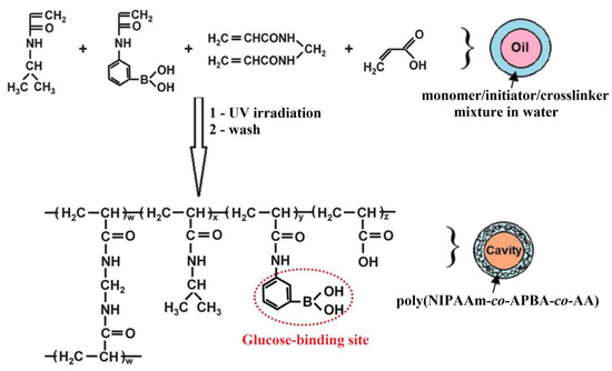 - Ancla, C.; Lapeyre, V.; Gosse, I.; Catargi, B.; Ravaine, V. Designed Glucose-Responsive Microgels with Selective Shrinking Behavior. Langmuir 2011, 27, 12693–12701. [Google Scholar] [CrossRef] [PubMed]