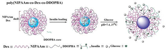 - Wu, Z.; Zhang, X.; Guo, H.; Li, C.; Yu, D. An Injectable and Glucose-Sensitive Nanogel for Controlled Insulin Release. J. Mater. Chem. 2012, 22, 22788–22796. [Google Scholar] [CrossRef]
