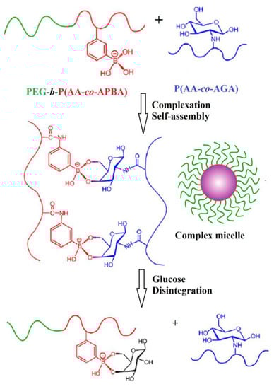 - Ma, R.; Yang, H.; Li, Z.; Liu, G.; Sun, X.; Liu, X.; An, Y.; Shi, L. Phenylboronic Acid-Based Complex Micelles with Enhanced Glucose-Responsiveness at Physiological PH by Complexation with Glycopolymer. Biomacromolecules 2012, 13, 3409–3417. [Google Scholar] [CrossRef] [PubMed]
