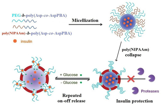 - Liu, G.; Ma, R.; Ren, J.; Li, Z.; Zhang, H.; Zhang, Z.; An, Y.; Shi, L. A Glucose-Responsive Complex Polymeric Micelle Enabling Repeated on–off Release and Insulin Protection. Soft Matter 2013, 9, 1636–1644. [Google Scholar] [CrossRef]