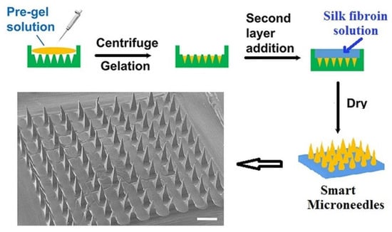 - Chen, S.; Matsumoto, H.; Moro-oka, Y.; Tanaka, M.; Miyahara, Y.; Suganami, T.; Matsumoto, A. Smart Microneedle Fabricated with Silk Fibroin Combined Semi-Interpenetrating Network Hydrogel for Glucose-Responsive Insulin Delivery. ACS Biomater. Sci. Eng. 2019, 5, 5781–5789. [Google Scholar] [CrossRef]