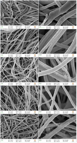 SEM pictures of PVFH (A,B), PVFH-10 (C,D), PVFH-20 (E,F), PVFH-30 (G,H), and PVFH-40 (I,J) membranes.