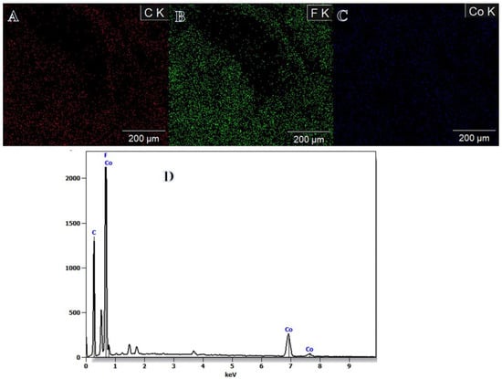 Mapping distribution of carbon (A); fluorine (B); cobalt (C) in the PVHF-40 membrane, and (D) EDX result of mapping image.