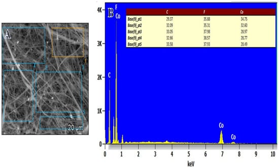 Figure 3A,B SEM-EDX shows a graph of the PVHF-40 membrane. The production of Co NPS around the PVDF-HFB nanofibers is confirmed by inspection of many points of the SEM image. It was confirmed that these composite membranes were successfully made thanks to the detection of carbon, cobalt, and fluorine peaks that are all relevant to their production. It is also confirmed that the amounts of produced elements are agreement with the used precursors.