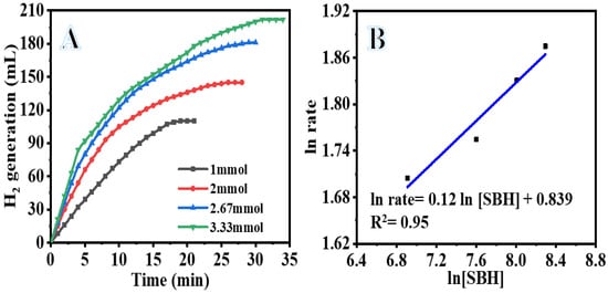The influence of SBH concentration on the dehydrogenation process (A) and ln H2 generation rate vs. ln [SBH] (B). The amount of catalyst = 100 mg and T = 298 K.