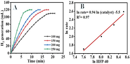 Factors such as SBH concentration, reaction temperature, catalyst amount, and catalyst reusability all have an impact on the efficiency of catalytic hydrolysis of SBH. As a direct consequence of this, investigation into the influence of these factors on SBH hydrolysis while PVHF-40 was present was carried out. The concentration of SBH is essential to the kinetics of the catalytic reaction since it is the source of hydrogen that is produced during the hydrolysis process. The influence of SBH concentration on the rate of H2 production was investigated at a temperature of 25 °C using 100 mg of PVHF-40. The catalytic activity of PVHF-40 is shown in Figure 8A. This activity was performed in the presence of varying doses of SBH. As demonstrated in the figure, the H2 production rose considerably as the SBH concentration was increased from 1 mmol to 3.3 mmol. This is because a low concentration of SBH was used, since greater concentrations follow the zero order reaction, as the viscosity rises with increasing SBH concentrations. As a consequence of the development of a low solubility by-product (NaBO2) during SBH hydrolysis, which is capable of adsorbing to the surface of the catalyst, the reactant diffusion resistance and reaction rate decrease, which ultimately leads to the blocking of active sites [,,,]. Comparatively to the studies that reveal a zero-order response, our research was conducted at a low concentration. The relationship between the H2 production rate and the SBH concentration is seen in Figure 8B. The H2 generation rate adheres to pseudo-zero order kinetics (slope = 0.123) in terms of the SBH concentration.