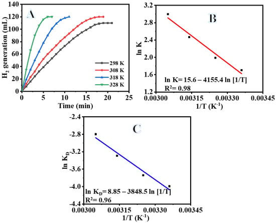 As was to be anticipated, raising the reaction temperature led to a rise in the volume production of H2 and resulted in a linear relationship between H2 volume and reaction time (Figure 10A). Because of the higher temperature, the time required for the reaction that results in the production of H2 decreased, as can be seen in the figure. In addition, the volume of H2 produced was raised. As may be seen in Figure 10, an increase in the reaction temperature from 25 to 55 °C caused an increase in the H2 production as 100% H2 was release in 6 min. The findings of this study are in agreement with those in previous research [,,]. The activation energy (Ea) of dehydrogenation of SBH hydrolysis using the Arrhenius Equation (4) in the temperature range from 25 to 55 °C in the presence of 100 mg PVHF-40 and 1 mmol SBH is as follows: