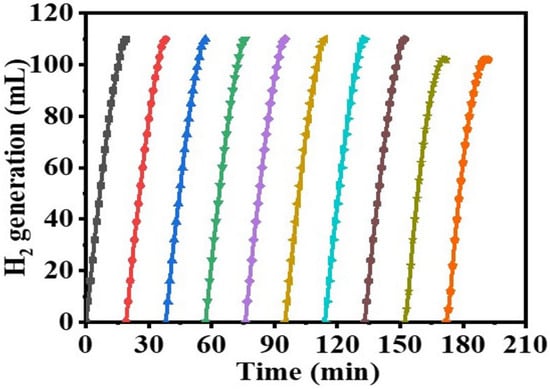 The linear portion of temperature graphs is used to calculate the rate (k). Figure 10B shows an Arrhenius plot of ln (K) versus 1/T. As seen in Figure 10B and the Arrhenius equation (Equation (4)), Ea = 35.21 kJ mol-1 was found. The literature reports activation energies for non-noble metals ranging from 16.28 to 42.45 kJ mol−1 [,,,,]. The obtained Ea value was compared with the Ea values of various Co-based catalysts and catalysts supported on polymer substrate. Some examples of these catalysts that can be found in the literature include Co-Ni/AC (68.84 kJ mol−1) [], Ni- PVF capsules (49.3 kJ mol−1) [], Ni-PVF hollow fiber (55.3 kJ mol−1) [], ([C6(mpy)2][NiCl4]2− (56.36 kJ mol−1) [], PVF-[C6(mpy)2][NiCl4]2−(44.54 kJ mol−1) [], Co-Ni/MWAC (40.7 kJ mol−1) [], Sm-Ni-Co-P/g-Al2O3 (52.05 kJ mol−1) [], Ni–Co–B (62 kJ mol−1) [], indicating a superior catalytic performance of the introduced Co@PVHF. The catalyst’s suitability for practical use is largely dependent on its reusability and stability. After the reaction, the Co@ PVHF catalysts may be separated simply by withdrawing the MNFs from the catalytic system. Separation as easy as that has a lot going for it. Without separating or activating the catalyst, SBH may be refilled into the reaction solution (1 mmol of SBH at 25 °C) (100 mg PVHF-40). For this reason, several cycles of SBH hydrolysis were performed to look into PVHF-40s for recycling. As the number of cycles rises, slight declines are seen (Figure 11). However, the same volume of H2 was generated by extending the reaction time. This may be because, when the membrane is reused without cleaning among cycles, reaction products precipitate out onto its surface, blocking the metal active sites and slowing down hydrogen production.