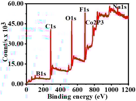 It has been hypothesized that a rise of NaBO2 precipitation on the PVHF-40 surface and the consequent rise in viscosity of the solution [], both of which impede active site accessibility or induce pore blockage, are responsible for the modest drop in the catalytic activity seen after the fifth cycle. This was confirmed by XPS of the PVHF-40 catalyst after ten cycles (Figure 12). As seen by the Co2p3 peak at 857 eV, Co(OH)2 was formed after six cycles of reuse. A Na 1s peak (1072.2 eV) and a B 1 s peak (180 eV) both showed up in the spectra. One possible explanation is that Na ions, which are predominantly impurities that are dissolved in the solution during dehydrogenation of SBH, are responsible for this. The results indicate that Co@PVHF performs well as a catalyst for SBH hydrolysis.