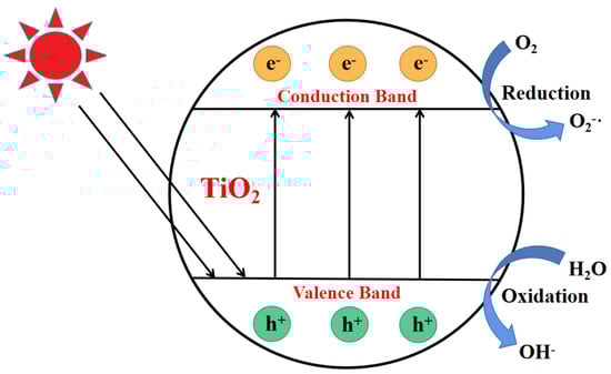 Photocatalytic degradation, as an advanced oxidation process, has made rapid progress since the discovery of the first water splitting reaction using a semiconductor in 1972 by Fujishima and Honda. As shown in Figure 1, the photocatalytic process begins from the semiconductor band gap. When an electron (e−) in a semiconductor valence band is excited to transition to the conduction band, photogenerated holes (h+) in the valence band will be generated in response, thus yielding electron-hole (e− and h+) pairs inside the semiconductor []. As a result, the excited electrons will produce free radicals to impel the photocatalytic reactions. Among various semiconductor catalysts, titanium dioxide (TiO2) is one of the best photocatalysts for inducing a series of reductive and oxidative reactions on its surface, as TiO2 is the most active photocatalyst under the photon energy of 300 nm < λ < 390 nm, and it remains stable after several catalytic cycles []. Besides this, TiO2 catalyst also has many functional properties, such as its strongly thermal stability and resistance to chemical damage, which promote its wide application in photocatalytic technology [].