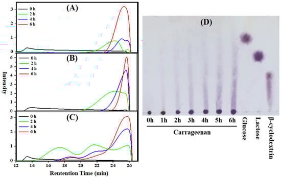 Molecular weight distribution changes of carrageenan during photocatalytic reaction monitored by HPGPC. (A) 300 mM H2O2, (B) 5% TiO2 and 300 mM H2O2, (C) 5% TiO2, and (D) TLC with 5% TiO2 of degraded carrageenan.